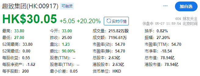 截至午间收市,趣致集团每股报30.05港元,大涨20.20%,总市值约78.94亿港元。