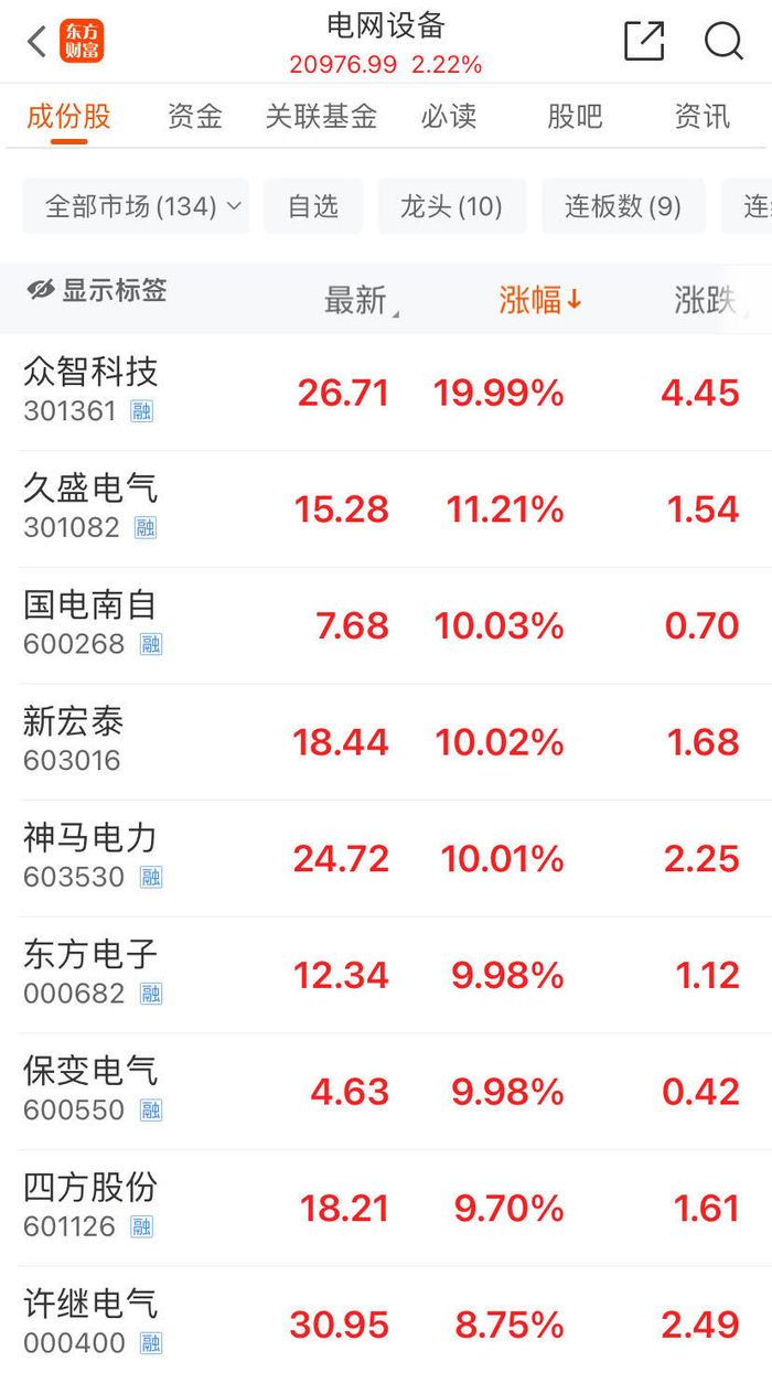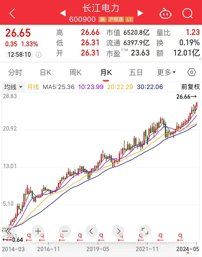 盘面上,电力、电网概念股维持强势,广西能源、众智科技、国电南自等涨停,其中巨头长江电力创下历史新高,截至上午收盘,股价达到26.65元,市值高达6521亿元。