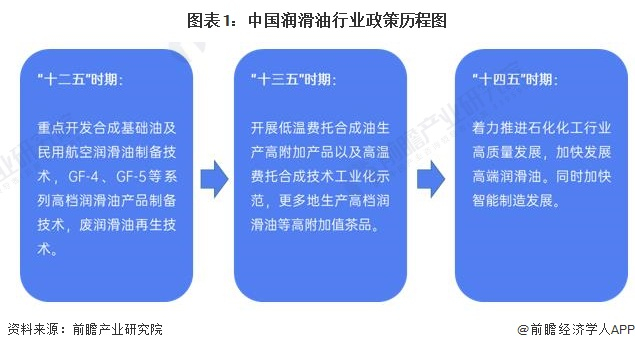 从相关政策历程来看,我国润滑油行业政策持续引导行业发展,主要以发展高端润滑油,产业规模化发展为主。“十二五”规划时期,国家重点开发合成基础油及民用航空润滑油制备技术、废润滑油再生技术等;“十三五”规划时期,国家鼓励开展低温费托合成油生产高附加产品及高温费托合成技术工业化示范;“十四五”规划时期,国家着力推进石化化工行业高质量发展,加快发展高端润滑油。