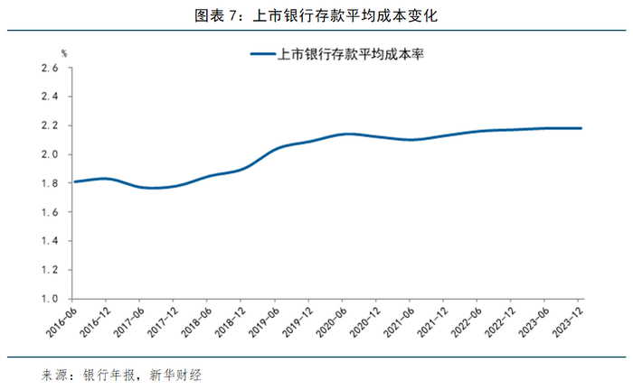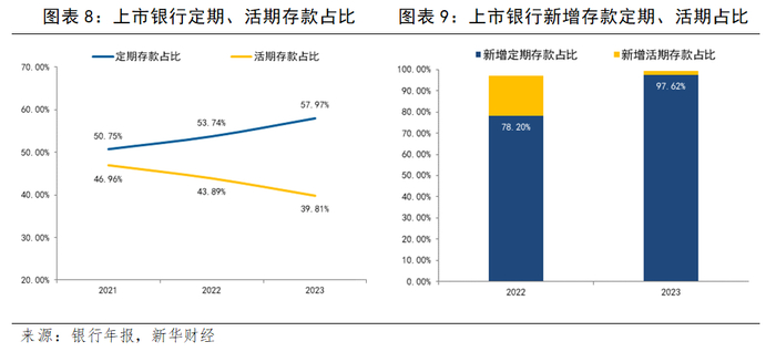 针对存款成本刚性上升的现象,上述报告分析指出,主要是当前经济环境和市场预期下,居民超额储蓄倾向和企业资金活化不足问题带来的存款结构变化所导致的。体现在两个方面:一是存款定期化、长期化;二是企业存款成本居高不下。数据显示,2023年上市银行存款中定期存款占比上升了4.32个百分点至57.97%,存款定期化趋势加强,同时当年新增存款中98%都是来自定期。此外,近年来,企业存款增长乏力,各家银行对企业存款的竞争加剧,导致企业存款成本居高不下,甚至高息揽存(手工贴息或者以利息之外的费用补贴形式)行为加剧现象,进一步增加成本。