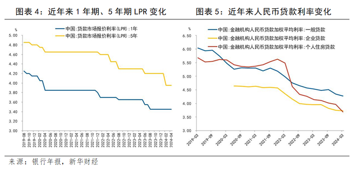 利率长期下行趋势延续,年内有望继续降息降准,银行资产端收益率持续承压。我国进入高质量发展阶段,经济进入中低速增长期,与之相伴的是无风险利率水平的长期下行。政策角度来看,货币、财政等宏观政策持续发力稳增长,今年货币政策前置发力,已于一季度降息降准,贷款和长债利率中枢明显下行。