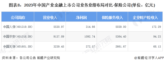 从产业金融保险主体的业绩表现来看,2023年,营业收入、净利润、保险服务收入水平最高的均为中国平安,3项指标分别达到9137.89亿元、1092.74亿元、5364.40亿元;企业财产险收入最高的是中国人保,2023年收入172.29亿元。