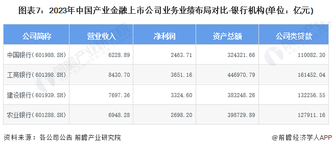 从产业金融银行主体的业绩表现来看,2023年,营业收入、净利润、资产总额、公司类贷款规模最大的上市企业均为工商银行,4项指标分别达到8430.70亿元、3651.16亿元、446970.79亿元、161452.04亿元。