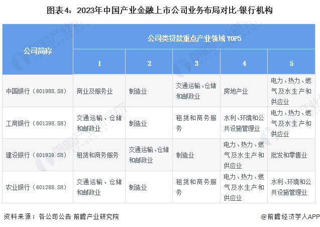 从产业金融银行主体的业务布局来看,工商银行和农业银行公司类贷款占比最大的领域均为交通运输、仓储和邮政业,中国银行公司类贷款的重点领域是商业及服务业,建设银行公司类贷款的重点领域为租赁和商务服务。
