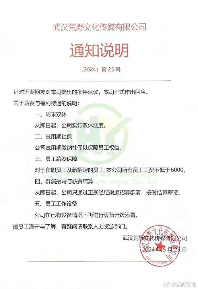 5月25日,网红“王妈”所属武汉荒野文化传媒有限公司发文回应近期关于员工福利的争议,称:一、周末双休。从即日起,公司实行双休制度。二、试用期社保。公司试用期缴纳社保以保障员工权益。三、员工薪资保障。对于在职员工及新招聘的员工,本公司所有员工工资不低于6000。四、群演招聘与薪资结算。从即日起,公司只通过正规经纪渠道招募群演,按时结算薪资。五、员工工作设备。公司在已有设备情况下再进行设备升级添置。
