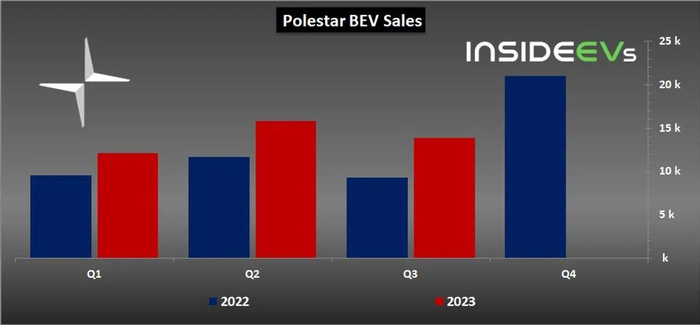 目标下调后,极星也没能完成,2023 年全年销量仅为 5.46 万辆,去年四季度销量仅为 1.28 万辆,同比下降 8%。