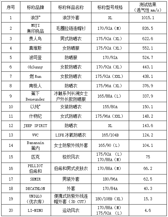 2. 透气性:透气性是指气体分子通过织物的性能,主要影响人体穿着舒适性,如通透、凉快。透气性测试值越高代表其透气性能越好。服装面料分为梭织面料和针织面料两大类,就透气性测试项目来说,两大类面料各自特点不同,都属于正常现象。梭织面料制作的防晒服装产品一般是织机以投梭的形式,将纱线通过经、纬向的交错而组成,因此梭织面料的线密度高,相应地其透气性较差,但是具有一定的防风性能,具有较高的耐磨损性。针织面料制作的防晒服装产品使用的纱线蓬松柔软,具有良好的弹性,面料延展性比较好,且面料相对空隙大,更为透气。本次20款防晒衣、皮肤衣样品为梭织面料的有6款,分别是:匹克、PELLIOT 伯希、SEMIR、DECATHLON、UNIQLO(优衣库)和LI-NING,其余14款样品为针织面料。本次比较试验的20款防晒衣、皮肤衣样品的透气性项目测试结果均达到相关标准要求,测试结果见表3。