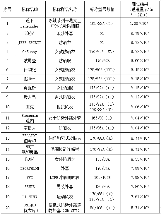 3. 透湿量:透湿量是指材料或物体在一定时间内透过水蒸气的能力。若布料的透湿效果差,皮肤表面的湿气无法有效排出,会慢慢凝结成水珠,聚集在皮肤表面与衣服之间,会使皮肤感到闷热和不适,易引发细菌滋生。本次比较试验的透湿量项目根据《纺织品 织物透湿性试验方法 第1部分:吸湿法》(GB/T 12704.1—2009)标准进行测试,测试值越高代表其透湿性能越好。本次比较试验的20款防晒衣、皮肤衣样品的透湿量项目测试结果均符合标准要求,测试结果见表4。