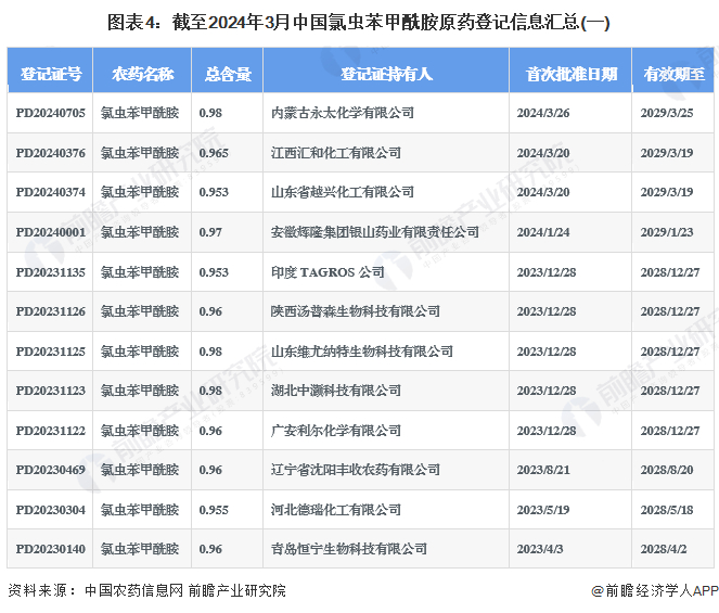 截至2024年3月,中国氯虫苯甲酰胺原药登记信息汇总如下: