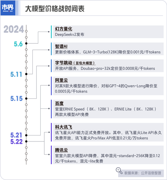 5月21日,阿里云宣布:旗下多款大模型的推理输入token降价,降价幅度为67%-97%。同日,百度文心大模型旗下两款模型ENIRE Speed、ENIRE Lite宣布免费。5月22日,腾讯云宣布,旗下多款大模型推理输入token降价,降价幅度为50%-87.5%。