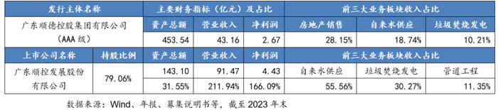 顺德控股主要从事公共事业业务、城市综合开发业务、建设投资业务及其他业务。公用事业是顺德控股的核心板块,以上市公司广东顺控发展股份有限公司(以下简称“顺控发展”)为运作主体,顺控发展是顺德控股重要营业收入和利润贡献主体,主要包括供水、污水处理等水务业务以及垃圾焚烧发电、环卫、危废、环境检测与环保咨询等环保业务。