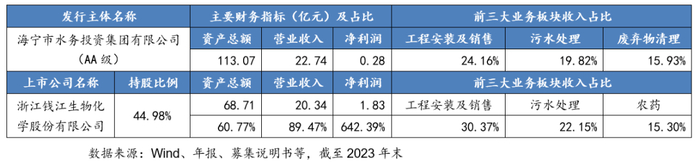 海宁水务信用评级较低,为AA级主体,自2023年10月以来仅发行一期私募债。海宁水务除作为区域内公用事业经营主体以外,还涉及其他产业板块,如生物制品业务由上市公司钱江生化负责,并为母公司贡献较多营收和净利润。海宁水务整体涉及传统类城投业务较少,且公用事业板块政府补贴占净利润的比重预计较小,净利润主要依赖于生物制品板块,因而新增债券融资概率高。