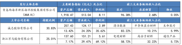 青岛西海岸新区海洋控股集团有限公司(以下简称“海控集团”)是青岛西海岸新区两大控股集团之一,战略定位为服务新区海洋经济,主要负责园区开发建设运营城市基础设施投资。海控集团主营业务板块主要包括工程代建、贸易、房地产、管理服务等,公司于2020年11月4日取得对万马股份控制权,2020年公司新增电力产品销售、高分子材料销售、通信产品销售和充电桩及充电服务业务,公司于2021年12月29日取得诚志科融控制权,2022年公司新增清洁能源产品、半导体显示材料产品等业务。