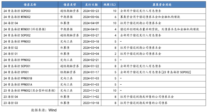 海控集团自2023年10月以来发行多期公司债券和协会产品,募集资金用途除部分借新还旧以外,还涉及偿还其他金融机构借款。海控集团清洁能源、半导体显示材料、生命医疗等高新科技产业板块均有下属上市子公司分别负责,对公司的营业收入及净利润贡献很大,经营性现金流表现较好,来源于政府的财政性现金流占比不高,在交易商协会侧新增融资较为通畅。