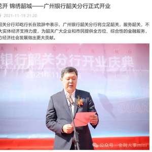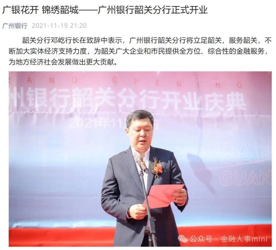 邓屹不再担任韶关分行行长职务;曾任广州银行花都支行行长、广州分行副行长,2021年11月19日,广州银行韶关分行正式开业,邓屹任行长。