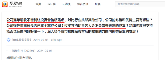 对于遥望科技2023年的业绩表现,有投资者近期向遥望科技提问时坦言“公司连年增收不增利让投资者倍感焦虑”。该投资者还提出疑问:对比行业头部其他公司,公司的劣势和优势主要有哪些?公司现任董事长是否已完全掌控公司?过多签约明星艺人会不会带来更高的成本?品牌溯源很支持能否也在国内好好做一下,深入各个省市挖掘品牌背后的故事助力国内优秀企业的发展?