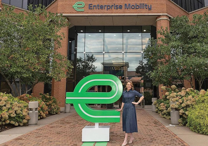 Enterprise公司的总部坐落于圣路易斯郊区,首席执行官克里斯·泰勒(Chrissy Taylor)环顾这个四层停车场的一楼,指了指她试驾过的两辆纯电车——一辆福特野马Mach-E和一辆黑色的Rivian R1T,说:“我们所有的员工都开电车。”