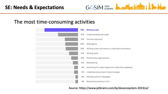 那么现实软件工程上的需要和开发者的态度是怎样呢?首先最耗时的活动还是编写代码。