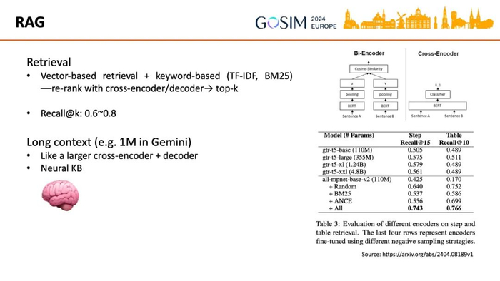 实践中经常是把基于向量的语义检索与基于关键字的检索结合起来使用。召回超过需要的结果数量后再用排序(re-rank)模型或者直接用生成模型选择最合适的少数结果。因为两种检索的召回率实际都很难达到非常高的水平,而性能更好的 cross-encoder 模式或者规模更大的生成模型计算量都太大,所以采取多召回再排序和甄选的方式来平衡性能和计算量,这与自然语言任务相同。而新出现的超大上下文窗口(比如 Gemini 的 1M)能容纳整个代码库的话,相当于在推理时自动建立了一个神经网络知识库(Neural KB),有可能比上述人工建立的层次化知识库(Hierarchical KB)达到更优化的状态。