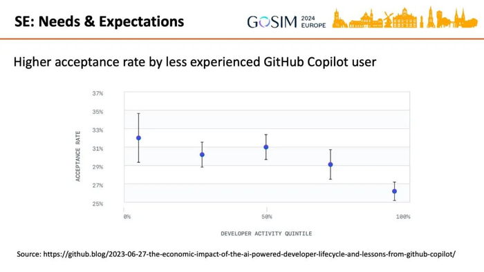 卢威提出了另一个问题:不同经验水平的程序员对这些问题的回答是否一致?另一个调查显示了不同经验水平的开发者的不同。更少编程经验的 GitHub Copilot 用户有更高的 AI 生成代码采纳率。这是因为较少编程经验的初级用户的任务较简单所以 AI 生成质量更高?还是初级用户使用 AI 的水平更高而得到更好的结果?抑或是高级用户更能发现 AI 生成的问题从而更少采纳?这些都有待研究。这就带来任务分层的思想,将在后面讨论。