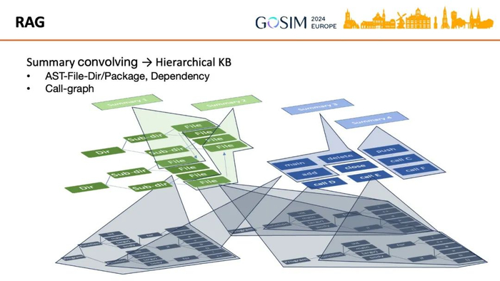 一个现实中的软件项目代码库往往包含数量庞大的函数和方法。如果要基于代码库来生成新代码,或者与 AI 进行问答以便理解和分析,则需要将代码库转变为一个知识库。一种方式是对函数和方法及其元数据用 LLM 做概括(summary),同一个代码文件或类的概括聚合起来再做概括,同一个文件夹(directory)或包(package)再一层层做概括。另外用代码静态分析工具提取调用图(Call-graph),图中的节点用 LLM 做概括,节点及其依赖的节点一起再做概括,并沿着图做层层概括卷积。这些概括用嵌入模型转化为向量以便进行语义检索。这样建立一个抽象层次层层提高的知识库(KB)。