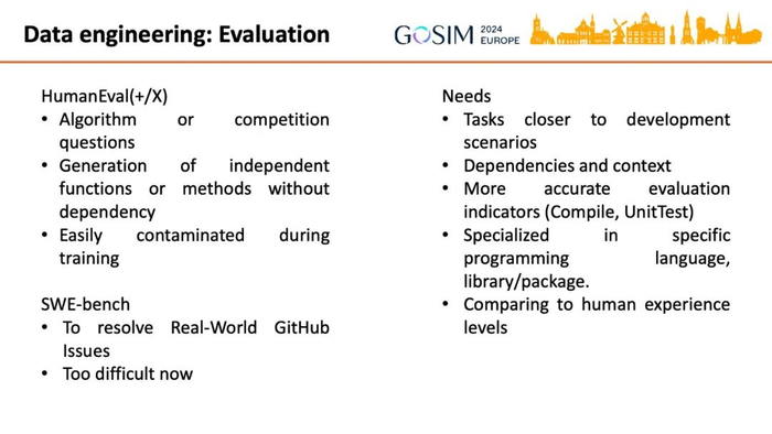 除了训练,评估模型的性能也需要数据集。目前主要是 OpenAI 的 HumanEval 数据集及其衍生产物,都存在相似的问题,包括评测任务是算法和竞赛题,目标是生成独立无依赖的函数(Function),与现实软件开发工作差异大;在训练中容易被污染,不能体现模型真实的能力。