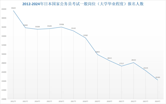 近日,日本人事院公布数据,2024年度日本国家公务员考试一般岗位(大学毕业程度)的报考人数为24240人,比去年减少了7.9%,更是创下了2012年度采取现行考试以来的报考人数新低。
