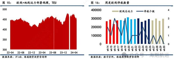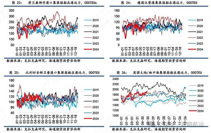 3.运力供给端:6月运力规模偏中性,周度平均运力28.1万TEU,环比5月下降2.4%。THE运力显著扩张,6月周均运力环比增加15.6%至6.7万TEU,主要是因为其暂无停航。2M周均运力显著收缩,环比下降11.4%至约7万TEU,wk23和24各一个停航,其余航次船舶推迟到港情况严重,船期较为混乱。OA在6月周均运力环比下降5.3%,wk23和24各一个停航。5月中旬欧洲在港集装箱船运力环比上行2.7%至192万TEU,去年11月以来最高水平。