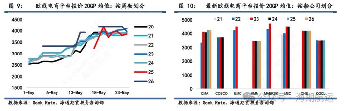 5月末即第22周线上报价均值小柜3854美金,大柜6476美金,明显高于前期宣涨的小柜2800美金和大柜5100美金的水平;这主要是因为船司现货舱位极其紧张,出现部分明显偏离均价的报价,例如MSC在5月末的钻石舱位报价3920/6540和马士基在第21周的报价大柜约在7000-7300美金。6月初线上运费持续走高,MSC线上钻石舱位报4520/7540(线下依然有常规FAK报价,虽然舱位紧张);周一马士基开舱wk23的上海——Felixstowe舱位价格,大柜报5500美金,持平其前宣布的自6月3日提涨的2825/5500;由于该价格明显低于市场水平,因此上线后售罄速度较快;周二继续开放至其他欧基港的舱位,报大柜5800美金起,目前包括鹿特丹和安特卫普在内的报价已经涨至7100美金以上,同样体现出执行底价开舱策略后订舱情况较好推动价格上行。部分船司上调线上6月价格,包括CMA的6月初价格由3230/6060提至3730/7060,HPL的6月16日起舱位价格由3359/6509提至4020/7630。我们建议更加理性的去参考此类明显偏离前期宣涨水平和当前平均水平的线上价格,尤其是在目前船司现货舱位有限的背景下,该价格的实际成交意义有限,更有可能是为后续提涨做出指引,需要注意过度参考而导致的和现货实际成交价格之间的认知差和预期差。