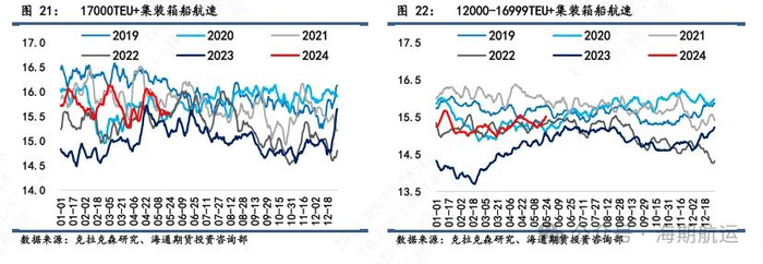 航速:航速处于正常波动范围。17000TEU以上的平均航速最新录得15.56节,维持平稳,实际航行速度维持在17-18节,马士基依然维持较高航行速度在21-22节。12000-16999TEU的平均航速持平在15.52节左右,前期港口拥堵对平均航速的负面拖累逐步缓解,航速小幅回升。