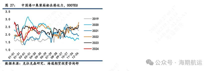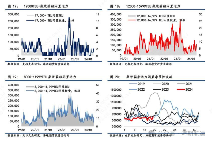 闲置:目前17000TEU以上仅2艘闲置,COSCO Shipping Star和Ever Goven在修船厂进行短期检修。12000-16999TEU闲置有8艘(合111277TEU),基本处于检修或者锚泊(多在红海区域),对比去年20艘的水平相比,目前闲置运力可提供的增量相对受限。