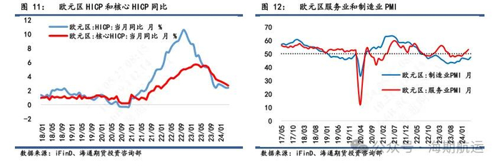 欧元区经济正处于恢复进程中。5月综合PMI初值报52.3,高于前值51.7和预期52,创下12个月以来新高;其中制造业PMI初值从4月的45.7升至47.4,尽管依然低于荣枯线,但已经是23年3月以来的最高值。分国家来看,德国制造业明显回暖,制造业PMI从4月的42.5升至45.4,是4个月以来的最高水平。
