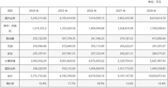 具体来看,2024-2028年,新华三预测的收入增长率分别为10.4、17.7%、18.9%、13.6%、10.4%。