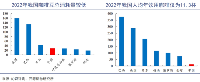 中国人口基数大,咖啡豆总消耗量与美国、巴西、日本等成熟市场相比,规模体量却相差三四倍。而且2022年中国人均年饮用咖啡数仅为11.3杯,远低于巴西的376.0杯、美国的288.9杯和日本的207.4杯。