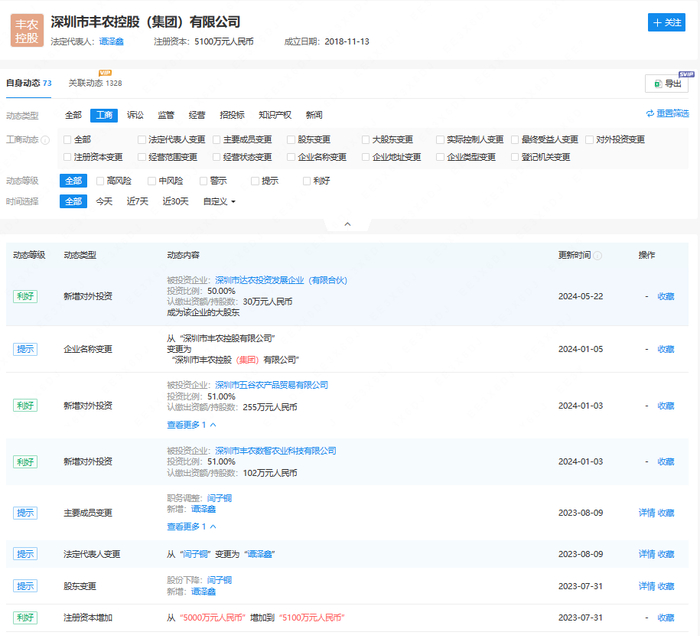 丰农控股的前身为深圳市丰农控股有限公司。据企查查,丰农控股成立于2018年11月,初始注册资本为5000万元,由闫子铜全额出资。2023年7月31日,丰农控股增资至5100万元,增资部分由闫子铜、谭泽鑫分别认缴50万元。