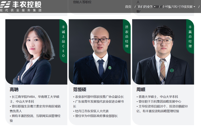 官网显示,丰农控股董事长闫子铜,谭泽鑫为丰农控股集团联合创始人。闫子铜还是全国青联委员、中国农村青年致富带头人协会副会长、广东青年发展现代农业促进会会长,曾入选《财富》中国40位40岁以下商界精英。