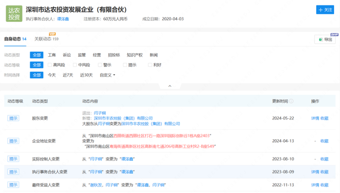 企查查显示,近日,深圳市达农投资发展企业(有限合伙)(达农投资)发生股权变更,股东闫子铜(持股50%)退出,新增股东深圳市丰农控股(集团)有限公司(丰农控股),持股比例50%。
