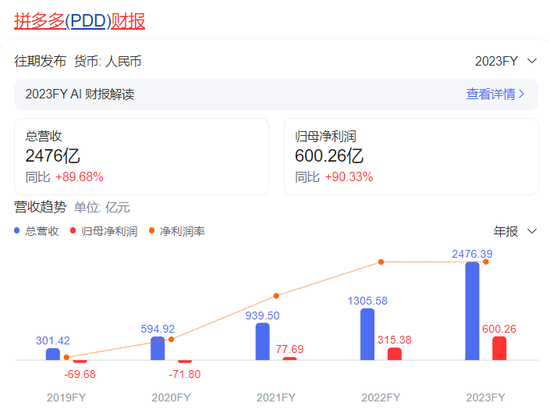 拼多多2023年全年营收为2476亿元,同比增长90%,归属普通股东净利润为600.265亿元,同比增长90%。