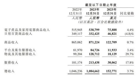 看看京东的财报,2023年全年商品收入为8712亿元,同比增长0.7%,服务收入则同比增17.8%至2134亿元。