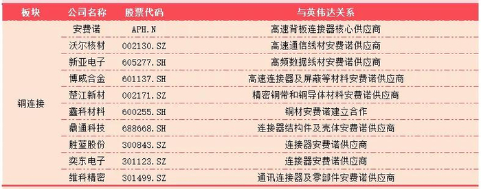目前英伟达高速铜连接的主要供应商是美国的安费诺,国内并无直接参与机构,但部分企业通过供货安费诺实现了间接联系。