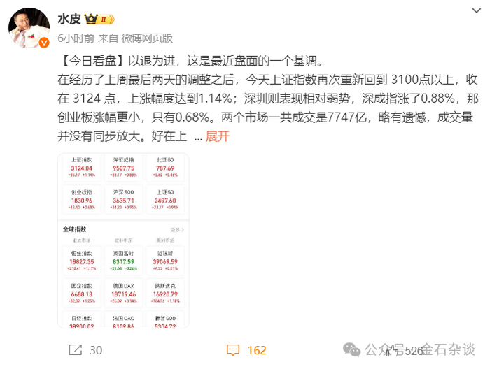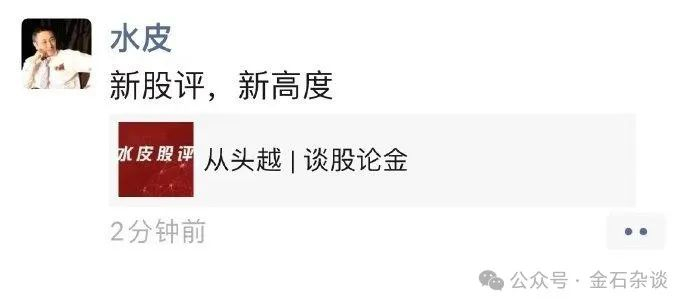 在微博中,水皮对今日盘面进行了点评。最后他说,“一句话点评:从头越。”从头越不知这里面是单纯聊股市,还是有别的什么意思。