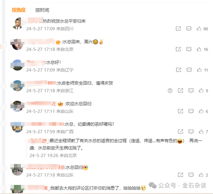 在评论区,一片欢呼之声:热烈祝贺水总平安归来;水皮老师安全回归,值得庆贺;还有粉丝留言:最近全程领教了有关水总的谣言的全过程(造谣、传谣…有声有色的) 再说一遍:水总前些天生病住院了。