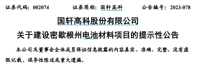 反倒是国轩高科在2023年10月25日发布的《关于建设密歇根州电池材料项目的提示性公告》中披露:“截止目前,已完成相关项目建设用地的购买合同签约。美国国轩于2023年10月24日与密歇根州政府签署完毕协议。上述协议的主要内容为:美国国轩预期对该项目在项目期限内分期投资的金额,密歇根州政府基于该项目投资规划拨付的专项补贴。最终投资额和补贴额将以实际投资情况为准。”
