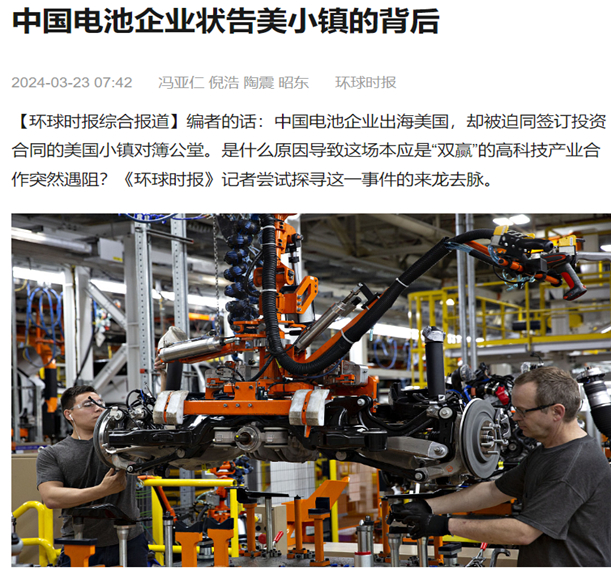 今年3月下旬,鼎鼎大名的官媒《环球时报》刊发了一份报道,题为《中国电池企业状告美小镇的背后》,其中提到国轩高科的美国子公司,在3月15日对美国密歇根州格林查特镇提起诉讼,称该镇违反了承诺接通供水管道的合同,令其在该州投资约24亿美元建电池组件工厂的计划受阻。