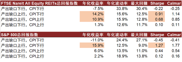 图表13:FTSE Nareit All Equity REITs美林时钟周期下的收益风险表现测算