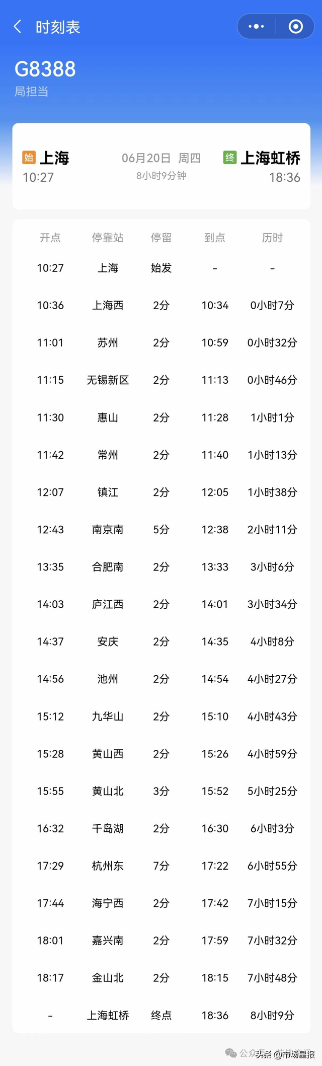 这条超级环线,是上海出发的首条跨越长三角三省一市的高铁线路。该车次列车沿途停靠上海站、上海西站、苏州站、无锡新区站、惠山站、常州站、镇江站、南京南站、合肥南站、庐江西站、安庆站、池州站、九华山站、黄山西站、黄山北站、千岛湖站、杭州东站、海宁西站、嘉兴南站、金山北站、上海虹桥站。