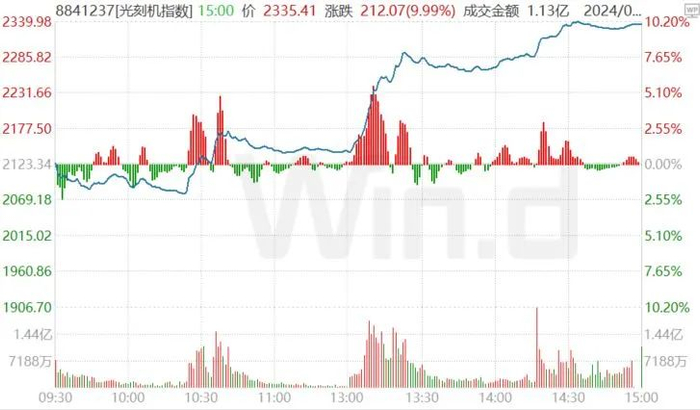 周一,芯片板块中的设备与材料涨幅惊人。Wind指数显示,光刻机指数单日涨超10%。