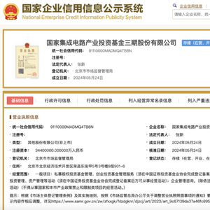 国家企业信用信息公示系统消息称,国家集成电路产业投资基金三期股份有限公司成立,注册资本3440亿元人民币。