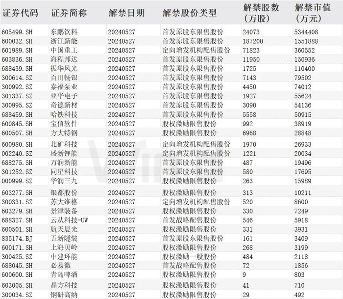 按5月24日收盘价计,5月27日是本周解禁高峰期,29家公司解禁市值合计804.85亿元,占本周解禁规模的85.73%。
