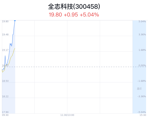 05月28日,全志科技(300458)股价大幅上涨,截至09点53分,全志科技上涨5.04%,报19.80元/股,成交1.20亿元,换手率1.23%。